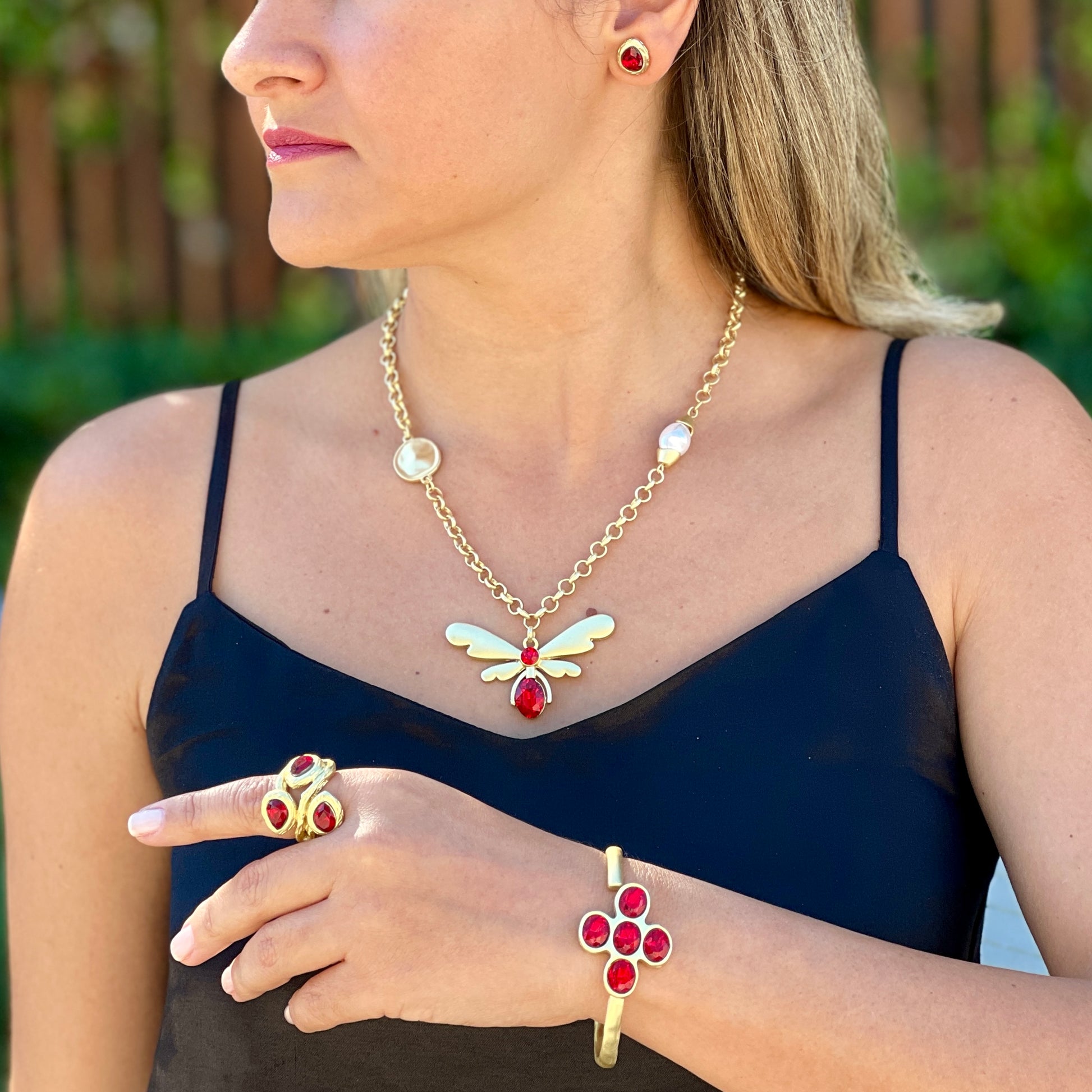 Dragonfly With Stone Red And Pearl Gold Necklace