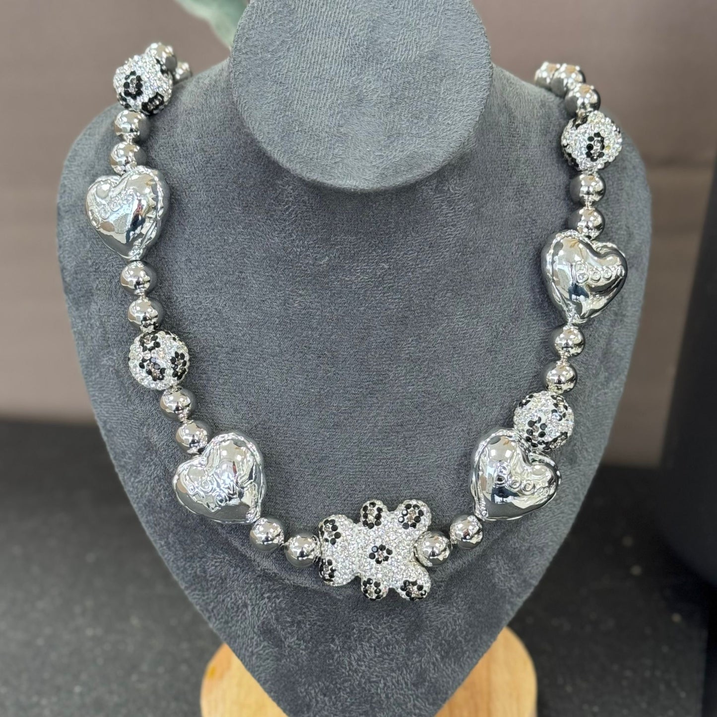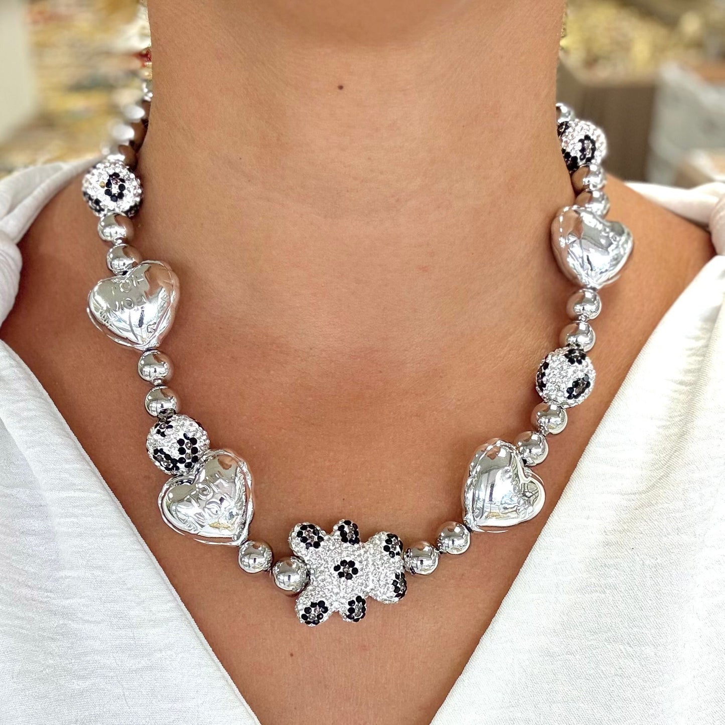 Teddy Print Silver Heart Necklace